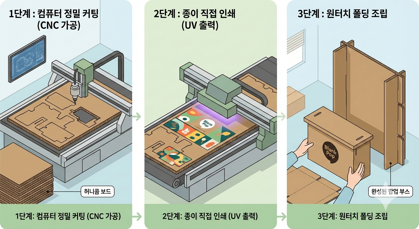 CNC 정밀 커팅 → UV 직접 인쇄 → 원터치 폴딩 조립