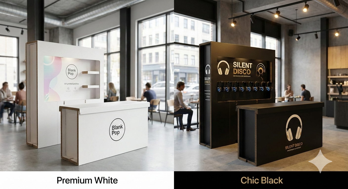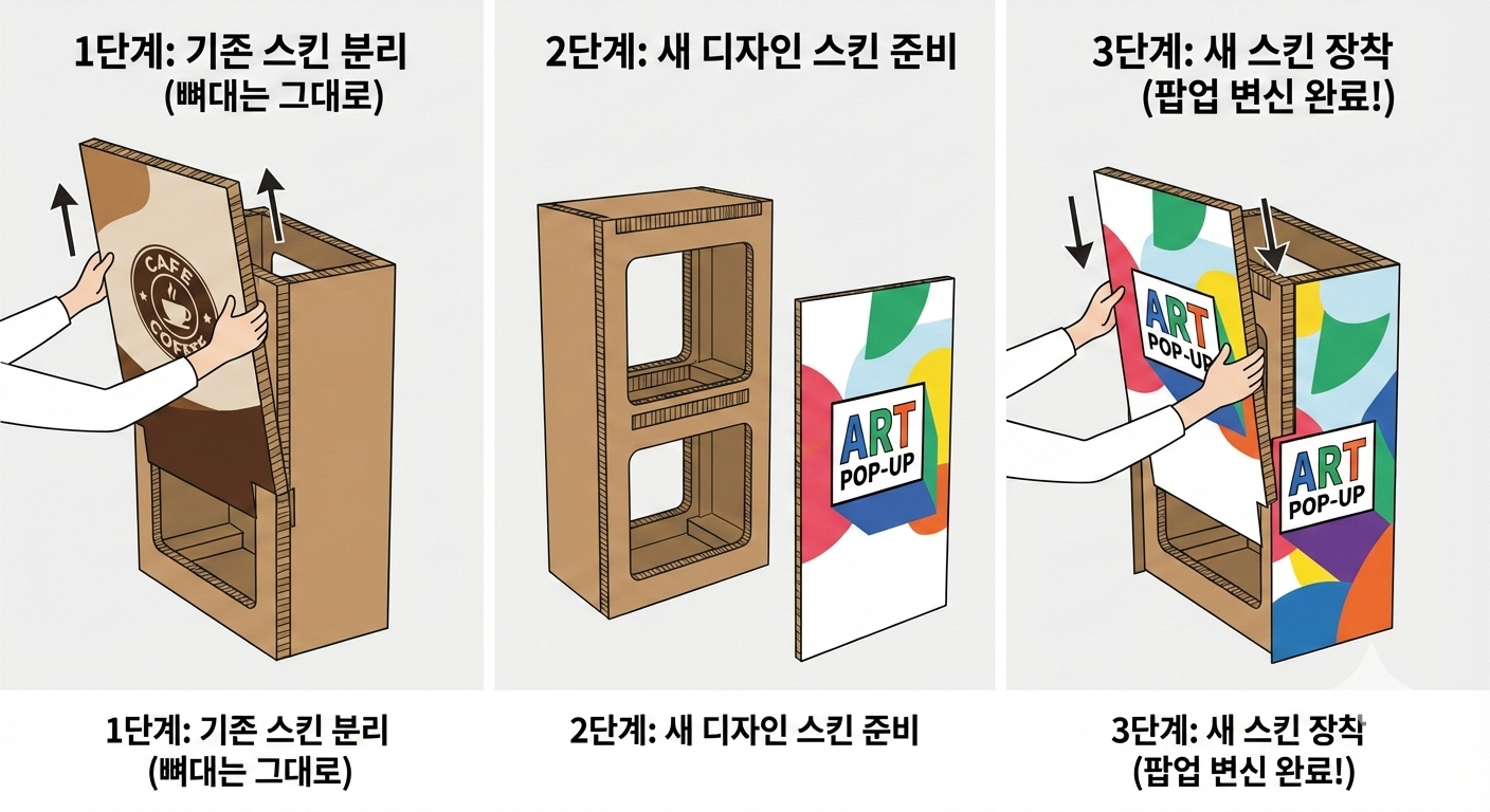 행사마다 새 부스를 살 필요 없습니다. 허니콤 뼈대는 재사용하고 스킨 패널만 교체하면 완전히 다른 브랜드 부스로 변신.